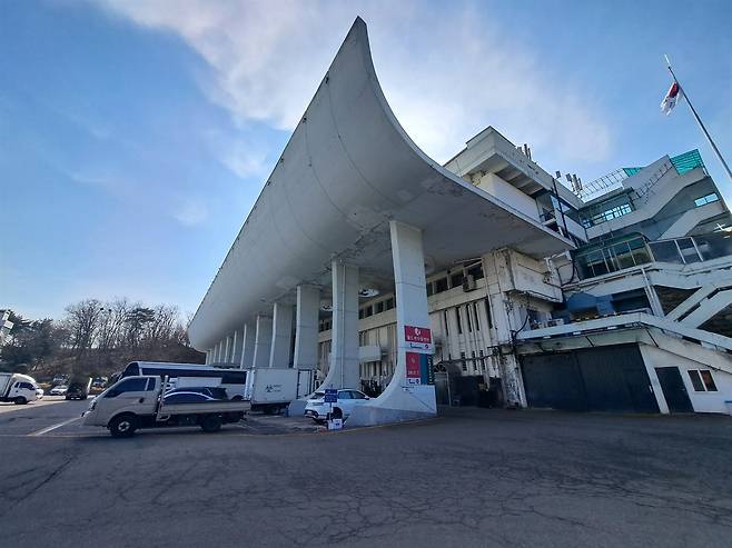 | ▲ 장충체육관 한양도성 성벽이 잘려 지워진 끝자락에 장충체육관이 앉아 있다. 1970~80년대 이곳에서 벌어지는 경기를 통해 사람들은 억눌린 열망과 함성을 분출해 냈다. |
