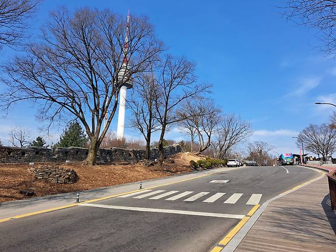 | ▲ 남산 버스 정류장 도성의 성벽과 남산타워, 차가 다니는 길의 끝에 버스 정류장이 있다. |