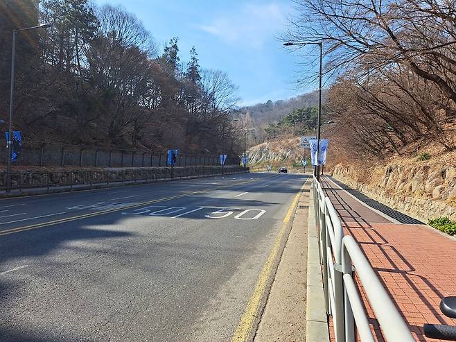 | ▲ 장충단로 국립극장 앞에서 본 장충단로. 직각에 가까운 각도로 꺾이는 도로가 많은 질문을 자아낸다. |