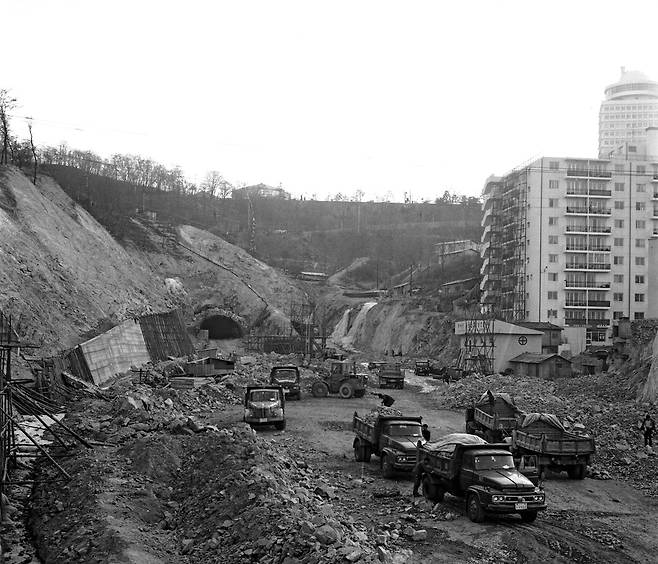| ▲ 남산 3호터널 공사(1977) 회현동 쪽의 3호터널 갱 입구, 1977년의 공사 현장 모습이다. |