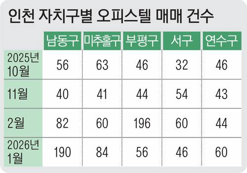 기초자치구별로는 남동구의 오피스텔 거래량 변화가 가장 두드러졌다. 지난해 10월 56건, 11월 40건, 12월 82건, 올해 1월 190건으로 가장 큰 폭으로 증가했다. 지난해 10월 56건 수준이던 거래량이 올해 1월 190건으로 3배 이상 급증하며 가파른 우상향 곡선을 그렸다. 인천시청과 교육청 등 공공기관이 밀집한 지역 특성상 실수요층이 두터운 데다, GTX-B 노선 등 교통 호재가 실거주 목적의 매수 심리를 자극한 것으로 분석된다. 지역 내 국가산업단지와 대규모 공장이 밀집한 특유의 인구 구조가 영향을 미쳤다는 분석도 있다.