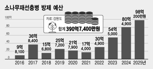 도내 한 지자체 관계자는 “현재 방제 사업은 확산을 최소화하는 수준에 머물러 있는 것이 현실”이라며 “선단지 등 확산 우려 지역을 중심으로 수종 전환과 방제를 병행하기 위해서는 인력은 물론 국비와 도비를 포함한 재정 지원 확대가 반드시 뒷받침돼야 한다”고 강조했다.