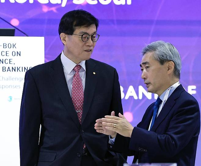 | 작년 한은 콘퍼런스서 이창용 만난 신현송 이창용 한국은행 총재(왼쪽)와 신현송 국제결제은행(BIS) 국장이 지난해 12월 17일 한국은행 국제 콘퍼런스에서 대화를 나누고 있다. 22일 한은 차기 총재로 지명된 신 후보자는 고유가발 인플레이션 관리와 경제 성장이란 과제를 안게 됐다. 뉴스1 |