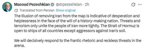 페제시키안 대통령은 "역사를 만들어가는 국가의 의지 앞에서, 이란을 지도에서 제거할 수 있다는 환상은, 절박함과 무력함을 드러낸다"면서 "우리는 이 무대에서의 광기 어린 수사와 무모한 위협에 단호히 대응할 것"이라고 강조했다.