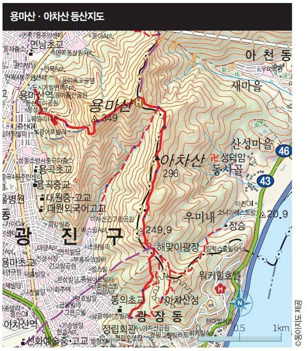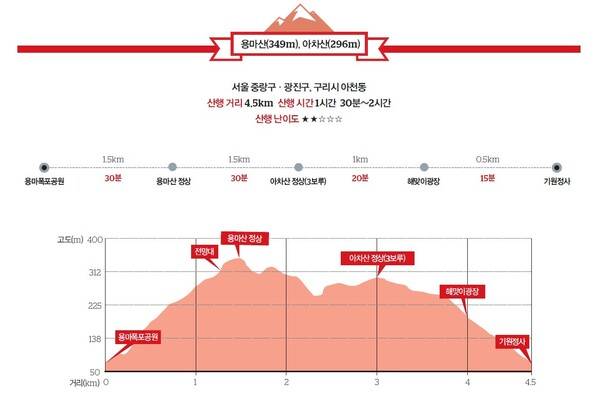 '퇴근 후 산행'의 첫 행선지가 용마산(349m)인 것은 이만한 '가성비'를 지닌 산이 서울에 몇 없기 때문이다. 서울 중랑구와 광진구, 구리시 경계에 있는 용마산은 도심과 바짝 접해 있어 30여 분 만에 정상에 이르며, 산 규모가 크지 않고 데크 길이 잘 정비되어 있어 초보자도 쉽게 오를 수 있다. 그보다 조금 낮은 아차산(296m)과 이어져 있어 두 산을 연계해 산행할 수도 있다. 북한산처럼 국립공원은 법적으로 야간 산행이 금지되니, 시선은 자연스레 근교의 작고 아담한 산들로 향한다.