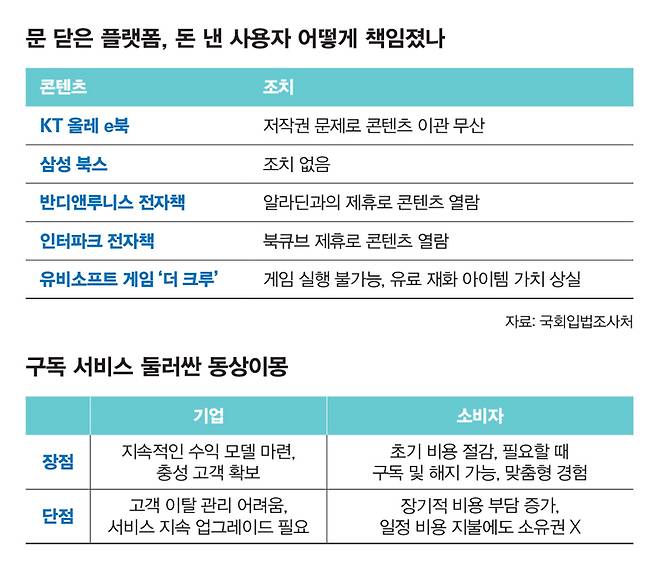 문제는 이 같은 구독 서비스의 '반쪽 소유권'이 이용 중에는 쉽게 인식되지 않는다는 점이다. 소비자는 서비스를 이용하는 동안 언제든지 이를 해지할 수 있다고 생각하지만, 구독을 해지하거나 기업이 서비스를 중단하는 시점에 이르러서야 해당 서비스의 소유권이 없어 구독을 쉽게 끊을 수 없다는 사실을 인지하게 된다. 비용을 지불하고도 안정적인 권리를 보장받지 못한 채 밑 빠진 독에 '디지털 월세'만 붓고 있었다는 사실이 뒤늦게 드러나는 것이다.