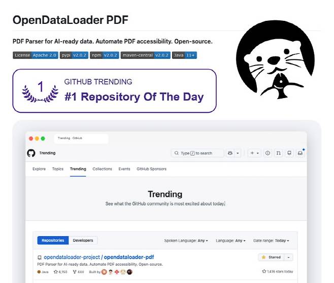[이데일리 김현아 기자] 한글과컴퓨터(030520)의 오픈소스 PDF 추출 도구 ‘오픈데이터로더 PDF’가 글로벌 개발자 커뮤니티에서 주목받고 있다. 복잡한 PDF 문서에서 글, 표, 이미지, 제목 구조를 분해해 인공지능(AI)이 활용하기 쉬운 데이터 형태로 바꿔주는 기능을 앞세워 깃허브에서 빠르게 관심을 끌고 있다. 저장소 기준 누적 스타(즐거찾기)는 8.3k, 포크(사용)는 561개 수준이다.
