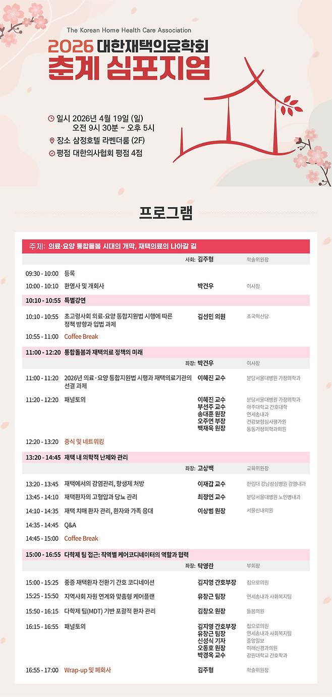 박건우 대한재택의료학회 이사장은 “초고령사회에서 의료와 돌봄의 체계가 병원 중심에서 지역사회·가정 중심으로 전환되고 있다"면서 “재택의료는 환자 삶의 질을 높이고 의료와 돌봄을 연결하는 핵심 의료 모델로 그 역할이 더욱 중요해졌다"고 말했다. 4월 16일까지 온라인에서 사전 등록이 가능하다. 02-548-1809