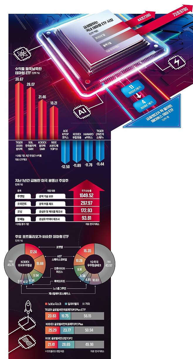 22일 금융투자업계에 따르면 이달 중순 기준 국내 테마형 ETF 순자산(AUM)은 총 73조9780억원으로 3개월간 약 30조원 불어났다. 2022년 말 12조8930억원에 그친 것에 비하면 다섯 배 넘게 증가했다. 최근 국내외 증시 상승세가 반도체, 고배당·주주환원, 우주·항공 등 일부 테마에 집중되자 테마형 ETF를 찾는 수요가 늘어났기 때문이다.