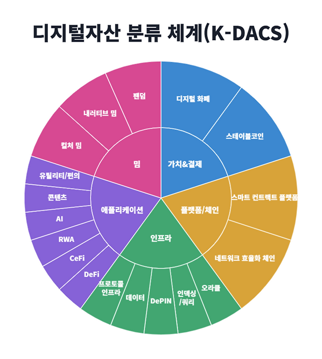분류구조는 대분류–중분류–소분류 3단계로 구성된다. 대분류는 생태계 내 기본 역할에 따라 가치&결제, 플랫폼/체인, 인프라, 애플리케이션, 밈 등 5개로 구분된다. 또한 중분류와 소분류는 각각 18개, 46개로 세분화한다.