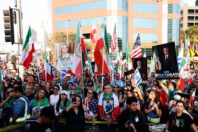 [로스앤젤레스=AP/뉴시스] 22일(현지 시간) 미 캘리포니아주 로스앤젤레스 웨스트우드 연방청사 인근에서 이란계 미국인들이 반이란 정권 시위를 벌이고 있다. 2026.03.23.
