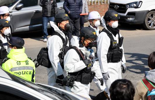 [23일 대전 대덕구 소재 자동차 부품 제조업체인 안전공업 주식회사 화재 합동 감식에 나선 경찰 관계자들이 불에 탄 건물 안으로 진입하고 있다. (사진=연합뉴스)]