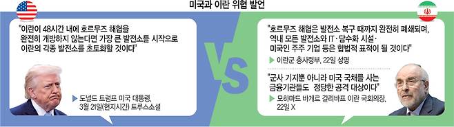 마수드 페제시키안 이란 대통령은 22일(현지시간) 트럼프 대통령의 위협에 “협박과 테러는 우리의 단결을 강화시킬 뿐”이라며 “호르무즈 해협은 우리 국토를 침범하는 자들 외에는 모두에게 열려 있다. 망상에서 나온 협박에 우리는 전장에서 단호하게 맞설 것”이라고 말했다. 앞서 트럼프 대통령은 21일 “이란이 지금부터 48시간 이내에 아무런 위협 없이 호르무즈 해협을 완전히 개방하지 않는다면 미국은 가장 큰 발전소를 시작으로 이란의 각종 발전소를 공격해 초토화할 것”이라고 말했다. 트럼프 대통령이 제시한 48시간 시한은 미국 동부시간으로 23일 오후 7시 44분(한국시간 24일 오전 8시 44분) 끝난다. 이란군의 경고는 더 거칠었다. 이란군 총사령부는 이날 미국의 이란 발전소에 대한 위협이 실행될 경우 호르무즈 해협을 완전 폐쇄하고 이스라엘의 모든 발전소와 에너지 인프라, IT 인프라 외에도 미국 주주가 있는 기업, 미군 기지가 주둔한 중동 지역의 발전소들도 파괴할 것이라고 목소리를 높였다. 이 같은 엄포가 현실이 될 경우 ‘전쟁 범죄’가 될 수도 있는 수준이다. 모하마드 바게르 갈리바프 이란 국회의장은 22일 X에 “미국 국채는 이란인의 피로 물들었다”며 “미국 국채를 사는 금융기관들도 정당한 공격 대상”이라며 중동 금융기관에 대한 공격을 예고했다.