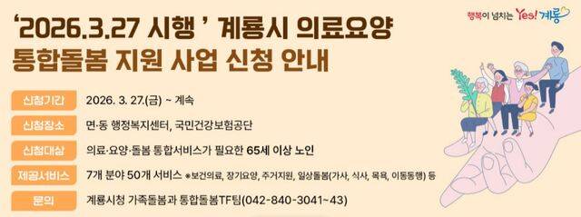 충남 계룡시는 오는 27일부터 시작되는 '의료·요양 통합돌봄 지원사업' 상담과 신청을 위해 면·동 행정복지센터 및 국민건강보험공단에 통합지원창구를 운영한다.
