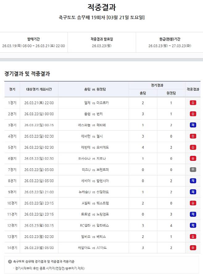 서울올림픽기념국민체육진흥공단(이사장 하형주)이 발행하는 체육진흥투표권 스포츠토토의 수탁사업자 한국스포츠레저㈜가 3월 21일부터 23일까지 진행된 잉글랜드 프리미어리그(EPL) 및 스페인 라리가 14경기를 대상으로 한 축구토토 승무패 19회차의 적중결과를 발표했다.