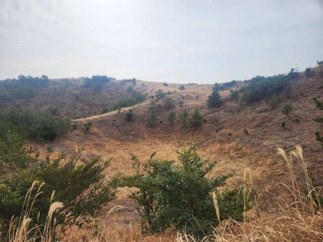 | ▲ 세 개의 분화구가 어우러져 만들어낸 오름의 웅장한 입체감. 새로운 세계를 만난 기분이 들었다. |
