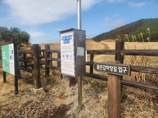 | ▲ 독특한 지그재그 진입로와 '쫄븐갑마장길' 이정표가 인상적인 따라비오름 입구. 여느 오름에서 볼 수 없는 이색적인 모습이었다. |