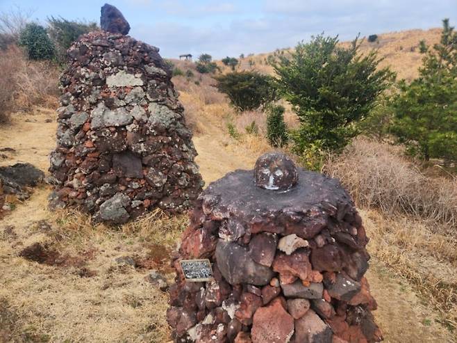 | ▲ 능선 곳곳에 세워진 크고 작은 돌탑들이 오름의 운치를 더한다. |