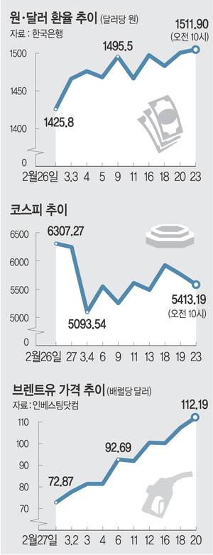 중동 사태가 해결의 실마리를 찾지 못한 채 장기화 조짐을 보이면서 국내 금융·외환시장이 23일 오전 동반 충격에 빠졌다. 미국과 이란 간 강경 대치가 이어지며 위험자산 회피 심리가 확산된 결과 원·달러 환율은 금융위기 이후 처음으로 1510원을 넘어섰고, 코스피는 기관과 외국인의 4조 원이 넘는 대규모 매도세로 5500선 아래로 밀려났다.