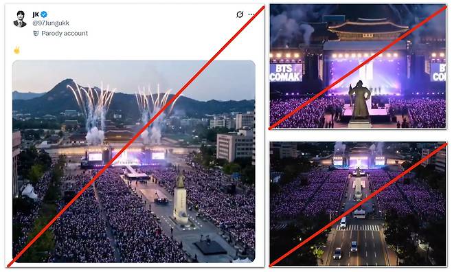 지난 21일 BTS 멤버 '정국'을 패러디한 X(옛 트위터) 계정에서 올린 게시물 영상이 대표적이다. 한눈에 보더라도 실제 공연 무대는 물론 이순신 장군 동상 위치 등 실제 광화문 광장 모습과 다르고, 광장 중앙에서 차량들이 갑자기 등장하는 장면까지 담겼다.