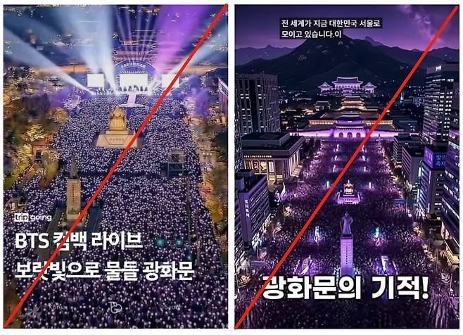 지난 21일 오후 8시 서울 광화문광장에서 열린 BTS(방탄소년단) 컴백 라이브 공연 전후 인공지능(AI)으로 만든 가짜 공연 영상이나 이미지가 확산되고 있다.