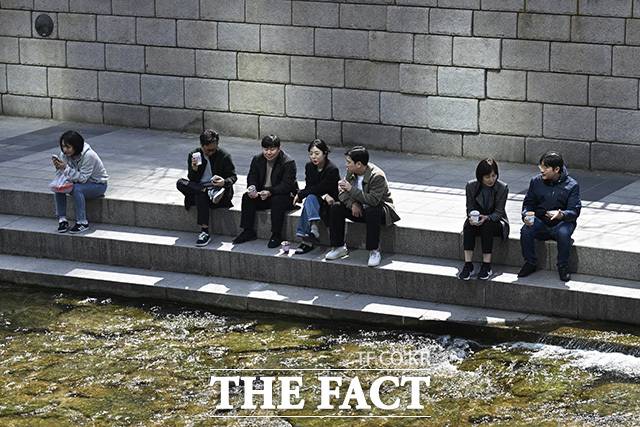 [더팩트 | 송호영 기자] 서울의 낮 최고기온이 19도를 기록해 큰 일교차를 보인 23일 오후 가벼운 옷차림의 시민들이 서울 종로구 청계천에서 휴식을 취하고 있다.