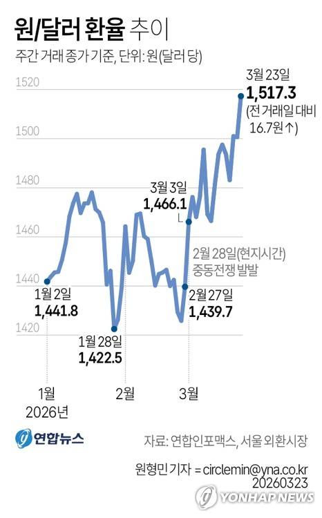 (서울=연합뉴스) 원형민 기자 = 23일 서울 외환시장에서 미국 달러화 대비 원화 환율의 주간 거래 종가(오후 3시30분 기준)는 전 거래일보다 16.7원 오른 1,517.3원이었다.