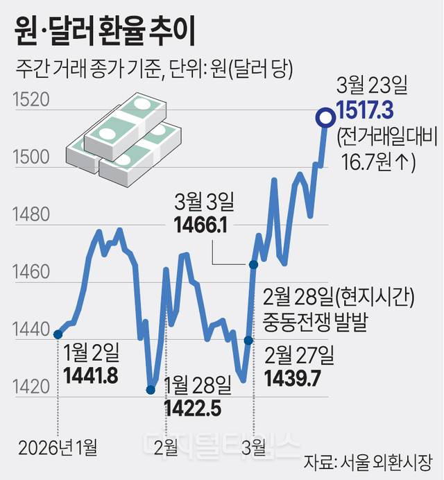 23일 서울 외환시장에서 원·달러 환율은 전 거래일보다 16.7원 오른 1517.3원에 주간 거래를 마감했다. 이는 주간 거래 종가 기준으로 글로벌 금융위기 당시인 2009년 3월 9일(1549.0원) 이후 약 17년 만에 가장 높은 수준이다. 환율은 이날 1504.9원에 출발한 뒤 장중 1510원을 넘어 상승폭을 키웠다.