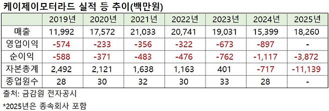 수익성 지표는 더 안좋다. 작년 연결 순손실은 39억원으로 전년(31억원)보다 증가했다. 케이제이모터라드 별도 영업이익은 2021~2022년 3억원대까지 줄었다가 이듬해 약 7억원, 2024년 약 9억원까지 재차 증가세에 있다.