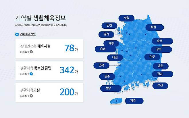| ▲ 대한장애인체육회 생활체육정보센터 대한장애인체육회 생활체육정보센터에 따르면 전국 장애인전용 체육시설 78개, 생활체육 동호인 클럽 342개, 생활체육교실 200개가 운영되고 있다. |