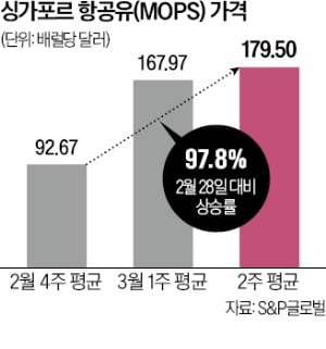 가격도 부담이다. 항공유 가격 기준이 되는 싱가포르 항공유(MOPS)는 중동 사태 2주차인 3월 둘째 주 배럴당 평균 179.5달러에 거래됐다. 중동 사태 이전보다 98%가량 급등했다. 3월 셋째 주에는 배럴당 200달러를 웃돌았다.