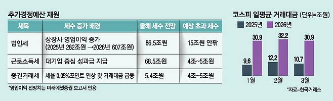 증권거래세도 세율 0.05%포인트 인상과 거래대금 급증 영향으로 세수 증가가 예상된다. 정부는 지난해 3조4000억원이던 증권거래세 수입이 올해는 5조4000억원 수준이 될 것으로 봤지만, 실제 수입은 이를 더 웃돌 수 있다고 예상하고 있다. 한국거래소에 따르면 1~3월 코스피 일평균 거래대금은 지난해 10조8000억원에서 올해 31조3000억원으로 급증했다.