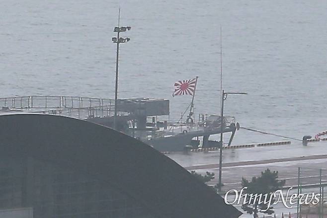 | ▲ 2023년 5월 29일 다국적 해양차단훈련 ‘이스턴 앤데버23’에 참가하는 일본 해상자위대 호위함 하마기리함이 욱일기의 일종인 자위함기를 게양한 채로 부산 남구 백운포 해군작전기지에 입항한 모습. |