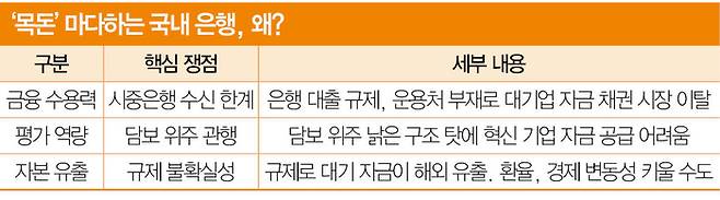 김용진 서강대 경영학과 교수는 “은행이 이자 수익에만 매달려 금융 기법이 발전하지 않는 전형적 후진국 금융 구조”라며 “미국 은행이라면 채권 매입이나 투자, 새 금융상품 개발에 나섰을 것”이라고 꼬집었다.