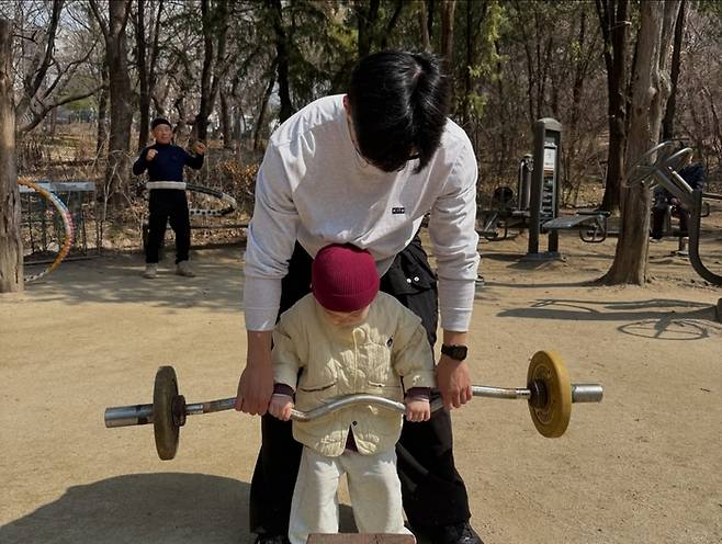 다른 사진에서는 아빠와 함께 역기를 드는 듯한 장난기 넘치는 모습부터 빵 가게 진열대를 바라보는 귀여운 뒤태까지, 아들의 다채로운 모습이 팬들의 미소를 자아냈다.