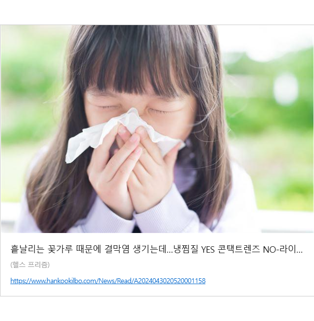 봄철에는 꽃가루와 먼지 때문에 눈이 가렵고 빨개지는 알레르기성 결막염이 잘 생겨요. 외출 땐 안경으로 눈을 가리고, 집에 와서는 인공눈물로 씻어낸 뒤 찬 수건으로 눈둘레를 살짝 냉찜질해보세요. 눈은 비비지 말고, 증상이 있을 땐 콘택트렌즈 대신 안경을 쓰는 게 좋아요.
