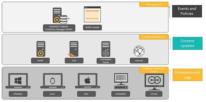 SEP는 시그니처 기반 탐지, 글로벌 인텔리전스 평판 분석(Global Intelligence Network), 정적 머신러닝(ML), 행위 기반 모니터링, 침입 방지(IPS), 애플리케이션 제어, 디바이스 제어, 방화벽 기능을 유기적으로 결합한 다계층 방어 아키텍처를 제공한다.