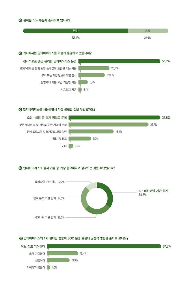 운영 현장에서 체감하는 불편 요소 역시 분명했다. 안티바이러스 사용 시 가장 큰 불편 요소로 오탐·미탐 등 탐지 정확도 문제가 37.8%를 기록했고, 잦은 업데이트 및 검사로 인한 시스템 부하(32.7%), 정상 프로그램 및 웹사이트의 과도한 차단(18.4%)이 뒤를 이었다. 이는 안티바이러스의 경쟁력이 실제 업무 환경을 방해하지 않으면서 필요한 위협만 정확히 걸러내는 정밀한 필터링 성능에 달려 있음을 보여준다.