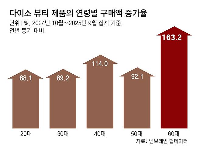 가성비(가격 대비 성능) 제품이 주력인 다이소 역시 기능성 제품 중심으로 빠르게 성장하고 있다. 비타민C 앰풀, PDRN 크림, 테카 토너 등 고기능 제품이 매출 상위권을 차지하고 있다.시장조사기관 엠브레인 딥데이터에 따르면 2024년 10월부터 2025년 9월 집계 기준 다이소 화장품 연령별 구매액 증가율은 60대가 전년 동기 대비 163.2%로 가장 높았다. 40대가 114.0%, 50대도 92.1%를 차지했다. 고가 제품 구매 전 저렴한 제품으로 먼저 사용해보는 ‘리트머스 소비’가 시니어층까지 확산된 결과로 풀이된다.
