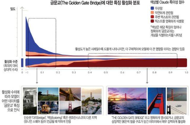 그런데 이 파라미터들은 모델이 학습으로 얻은 거대한 숫자 표이다. 모델이 학습한 모든 자료가 이 숫자 표에 녹아 있는 것이다. 다시 말해 AI의 본질은 학습 데이터가 압축된 파라미터들 속에 녹아 있다고 볼 수 있다. 이는 앤트로픽이 2024년 5월 발표했던 ‘Mapping the mind of a Large Language Model’이라는 연구에 명확하게 담겨 있다. 당시 연구진은 ‘블랙박스’로 여겨지는 모델 내부에서 특정 개념이 어떻게 활성화되는지 찾아내어 그 중 샌프란시스코의 금문교에 해당하는 파라미터 셋을 특정하여 강하게 활성화한 ‘금문교 클로드’ 모델을 만들었다. 그 결과 이 모델은 모든 답변을 금문교와 연관 짓기 시작했다.