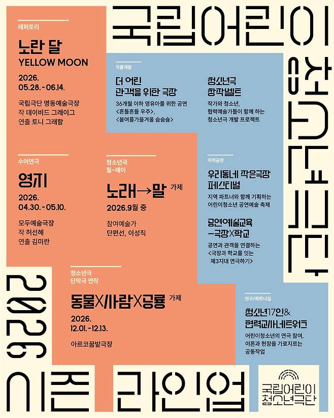 한편 국립어린이청소년극단은 올해도 연구개발 프로젝트 ‘청소년극 창작벨트’와 36개월 이하 영유와 보호자를 대상으로 한 ‘더 어린 관객을 위한 극장’을 이어간다. 이와 함께 청소년·교사 참여 프로그램, 공연 연계 워크숍 및 리서치 등을 통해 관객이 창작 과정에 참여하는 시스템을 운영하고, 지역 소극장 및 학교와 협력한 공연·예술교육, 야외 축제형 ‘우리동네 작은극장’ 등 지역 협력 모델 개발을 통해 어린이·청소년 공연 생태계 확장을 추진한다.