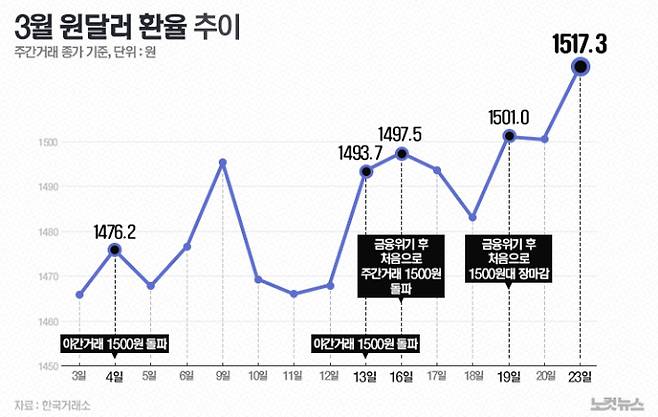 3월 초 1460원대, 중동 전쟁 후 1500원대로 수직 상승