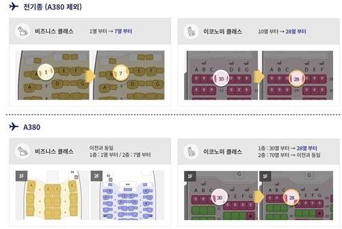 가장 큰 A380(495석) 기종을 제외한 다른 기종은 비즈니스 클래스 좌석 시작열을 1열에서 7열로 옮기고 이코노미 클래스는 시작열을 10열에서 28열로 바꾼다. A380 기종은 비즈니스(1·2층) 좌석 및 2층 이코노미(70열∼)는 현재와 동일하고 1층의 이코노미 좌석 시작열을 30열에서 28열로 옮긴다.