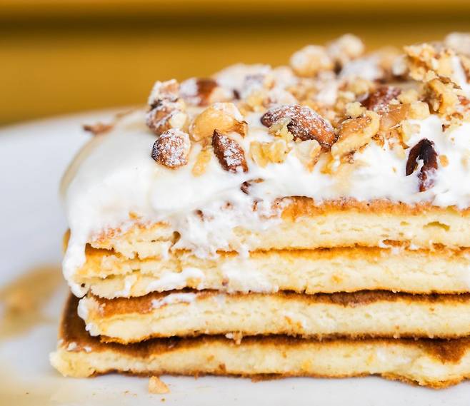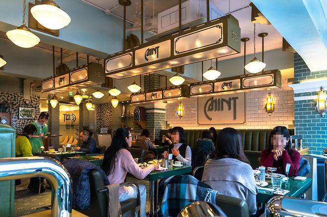 느긋한 여유가 필요한 날이라면 제격일 카페다. 주문 즉시 팬케이크를 만들기 시작해 완성된 팬케이크를 만나기까지 15~25분을 기다려야 한다. 그런데도 가게에 앞 대기하는 사람들을 보면 기대감이 피어오른다. 가게가 위치한 2층에 올라서자마자 1920~30년대 미국 카페로 여행을 온 듯한 분위기를 더한다. 민트색으로 주를 이룬 아르데코풍 인테리어는 카페 바깥 공간까지 감싸고 있다.