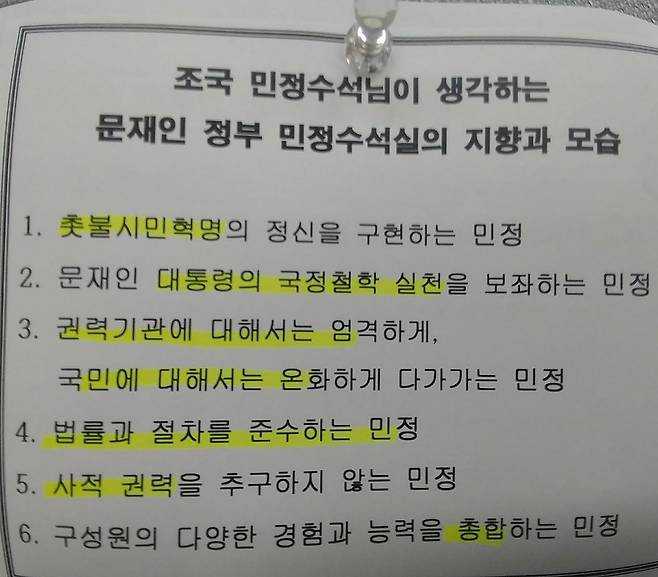 | ▲ 2017년 6월 민정비서관실 필자 책상 앞 칸막이에 붙여둔 내용 |