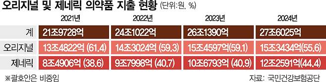 같은 기간 제네릭 의약품 지출액은 12조 2591억 원으로 집계됐다. 2021년(8조 4906억 원)에 비해 3년 만에 약 3조 7000억 원(44.4%) 증가한 규모다. 같은 기간 의약품 지출액에서 제네릭 비중도 38.6%에서 44.4%로 확대됐다. 오리지널 의약품은 15조 3434억 원으로 여전히 절반 이상을 차지하고 있지만 점유율은 감소하는 흐름을 이어갔다.