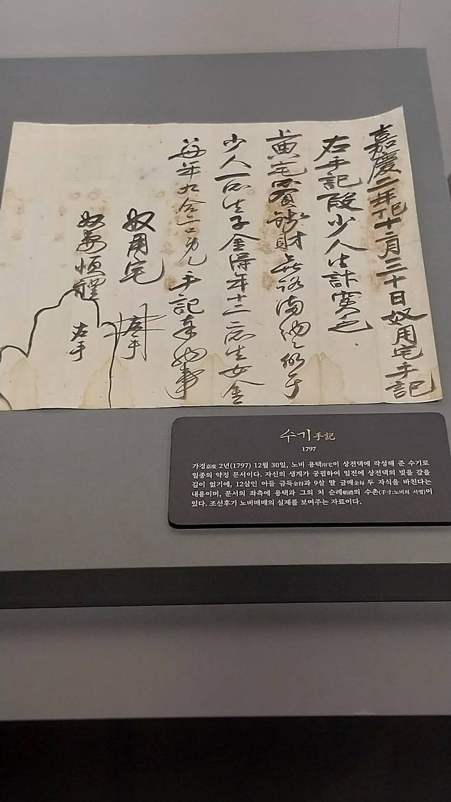 이번 전시에서 밀양 박씨 가문의 교지, 묘지석 등도 흥미롭게 살펴보았으나, 나의 시선이 가장 오래 머문 문서는 노비 문서였다. 한 노비가 빚을 갚지 못해 12살과 9살의 자녀를 노비로 바친다는 내용의 문서이다. 조선후기 신분제 사회의 단면을 보여주면서도, 당시 양반가문이 아닌 이들의 스산했던 삶의 모습이 떠올랐다. 이름없이 살아간 그들의 삶도 우리의 역사일 것이다.