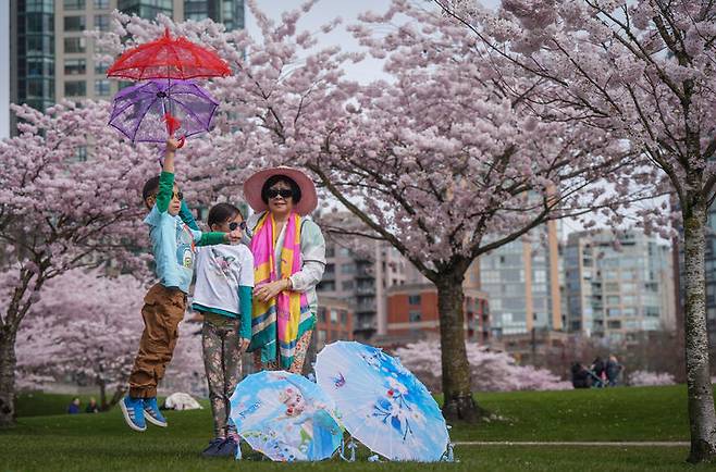 [밴쿠버=AP/뉴시스] 23일(현지 시간) 캐나다 브리티시컬럼비아주 밴쿠버의 데이비드 램 공원에서 한 여성이 손주들과 함께 만개한 벚꽃을 배경으로 사진을 찍고 있다. 2026.03.24.
