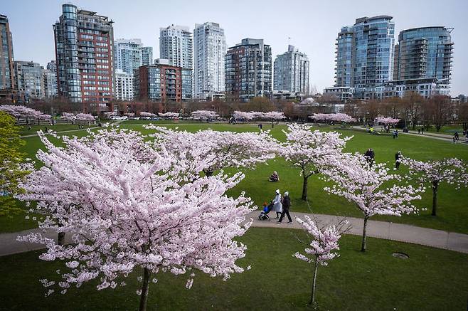 [밴쿠버=AP/뉴시스] 23일(현지 시간) 캐나다 브리티시컬럼비아주 밴쿠버의 데이비드 램 공원에서 방문객들이 만개한 벚꽃 사이를 산책하고 있다. 2026.03.24.