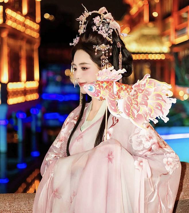 또 다른 사진에서는 붉은 등이 가득한 야경 속에서 중국 전통 소품을 활용해 포즈를 취하며 마치 화보 같은 장면을 연출했다. 자연스럽게 어우러진 배경과 스타일링이 ‘현지 감성’을 극대화했다는 반응이다.